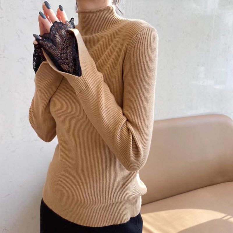 【レース付きタートルニット】ウール、チクチクしない、快適、オシャレ、ソフト